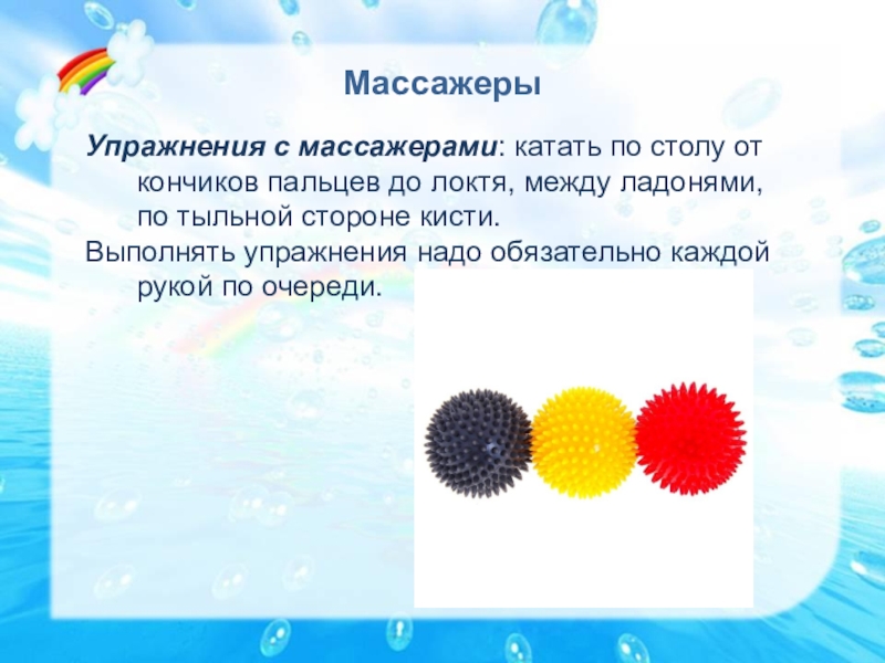 Упражнения с массажерами: катать по столу от кончиков пальцев до локтя,