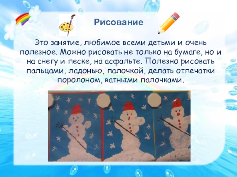 только на бумаге, но и на снегу и песке, на асфальте. Полезно рисовать пальцами, ладонью, палочкой, делать отпечатки поролоном, ватными палочками.