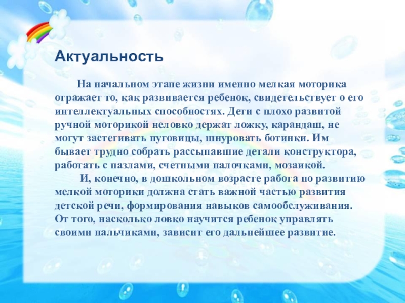 Слайд 9Значение развития тонкой моторики рук в дошкольном возрасте