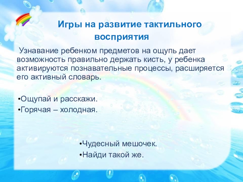 Игры на развитие тактильного восприятия: «Найди такой же на ощупь», «Чудесный мешочек».