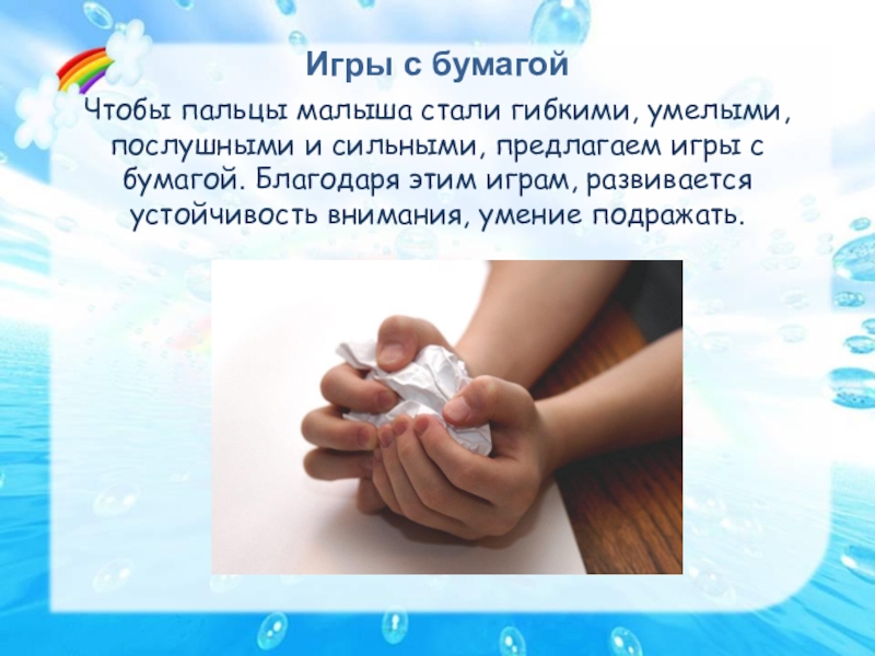 предлагаем игры с бумагой. Благодаря этим играм, развивается устойчивость внимания, умение подражать.
