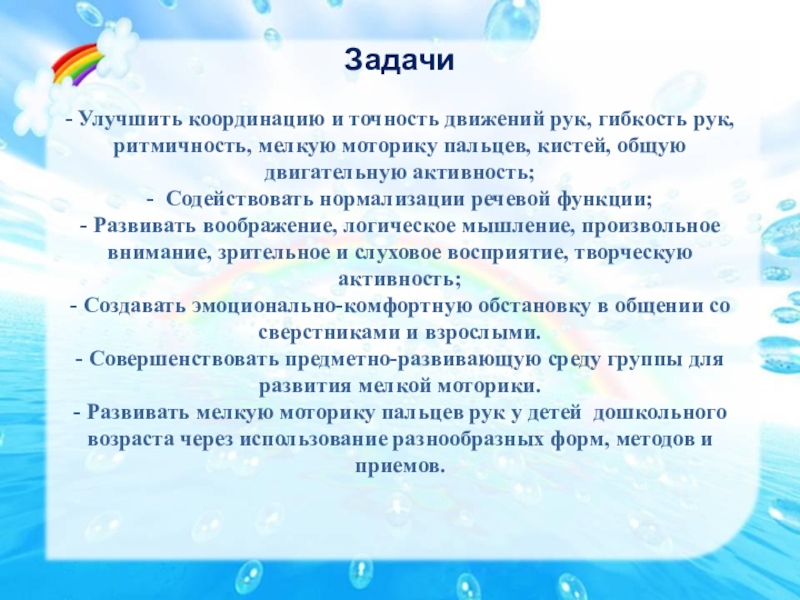 - Улучшить координацию и точность движений рук, гибкость рук, ритмичность, мелкую