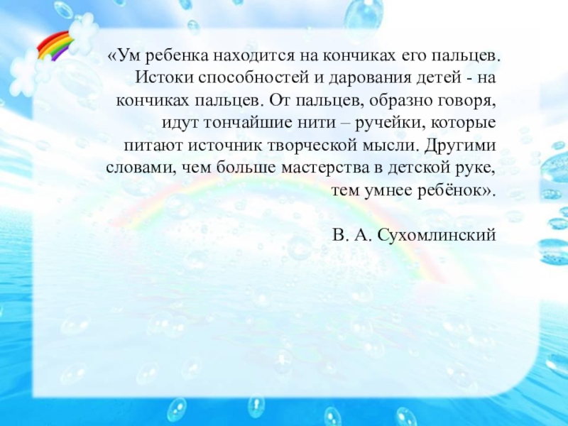 Слайд 2«Ум ребенка находится на кончиках его пальцев. Истоки способностей и дарования детей -