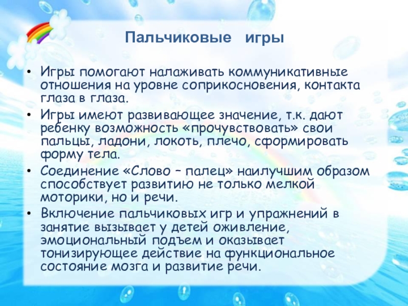 Включение пальчиковых игр и упражнений в занятие вызывает у детей оживление, эмоциональный подъем и оказывает тонизирующее действие на функциональное состояние мозга и развитие речи.