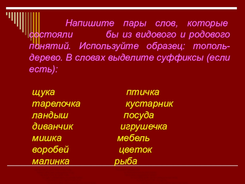 Прочитайте. Определите смысловую связь между словами левой части каждого примера. Составьте такую же пару из слов правой части, выбрав для этого одно из заключенных в скобках словах. Исходные и составленные пары напишите. Выделите в них окончания. Какое слово среди них лишнее?