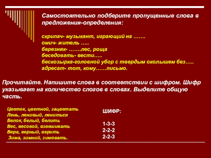Прочитайте. Напишите слова в соответствии с шифром. Шифр указывает на количество слогов в словах. Выделите общую часть.