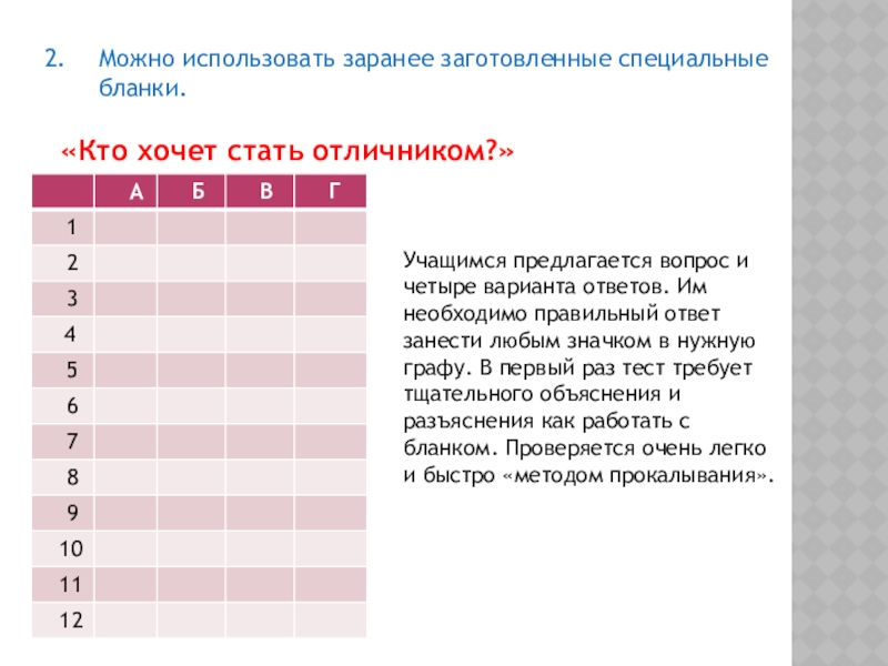вопрос и четыре варианта ответов. Им необходимо правильный ответ занести любым значком в нужную графу. В первый раз тест требует тщательного объяснения и разъяснения как работать с бланком. Проверяется очень легко и быстро «методом прокалывания».