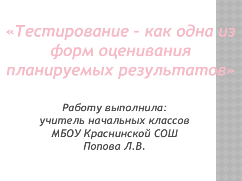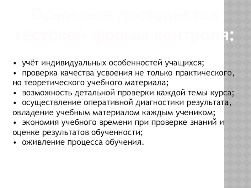 Тесты – это не то же самое, что набор упражнений или дидактический материал, это система специальных стандартизованных заданий, применяемая в сочетании с определенной методикой измерения и оценки результата.