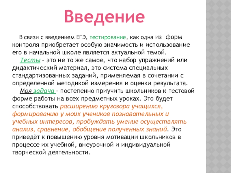 Моя задача - постепенно приучить школьников к тестовой форме работы на всех предметных уроках. Это будет способствовать расширению кругозора учащихся, формированию у моих учеников познавательных и учебных интересов, пробуждать умение осуществлять анализ, сравнение, обобщение полученных знаний. Это приведёт к повышению уровня мотивации школьников в процессе их учебной, внеурочной и индивидуальной творческой деятельности.