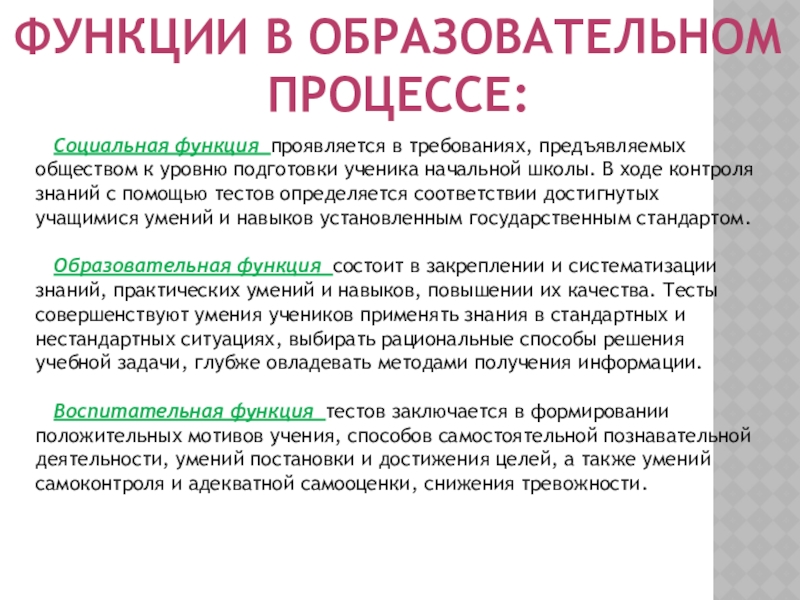 Воспитательная функция тестов заключается в формировании положительных мотивов учения, способов самостоятельной познавательной деятельности, умений постановки и достижения целей, а также умений самоконтроля и адекватной самооценки, снижения тревожности.