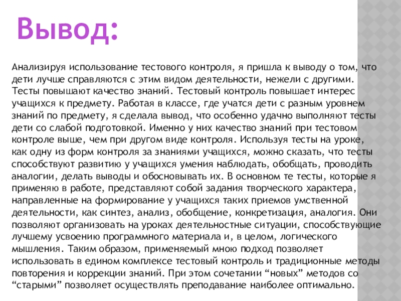 дети лучше справляются с этим видом деятельности, нежели с другими. Тесты повышают качество знаний. Тестовый контроль повышает интерес учащихся к предмету. Работая в классе, где учатся дети с разным уровнем знаний по предмету, я сделала вывод, что особенно удачно выполняют тесты дети со слабой подготовкой. Именно у них качество знаний при тестовом контроле выше, чем при другом виде контроля. Используя тесты на уроке, как одну из форм контроля за знаниями учащихся, можно сказать, что тесты способствуют развитию у учащихся умения наблюдать, обобщать, проводить аналогии, делать выводы и обосновывать их. В основном те тесты, которые я применяю в работе, представляют собой задания творческого характера, направленные на формирование у учащихся таких приемов умственной деятельности, как синтез, анализ, обобщение, конкретизация, аналогия. Они позволяют организовать на уроках деятельностные ситуации, способствующие лучшему усвоению программного материала и, в целом, логического мышления. Таким образом, применяемый мною подход позволяет использовать в едином комплексе тестовый контроль и традиционные методы повторения и коррекции знаний. При этом сочетании “новых” методов со “старыми” позволяет осуществлять преподавание наиболее оптимально.