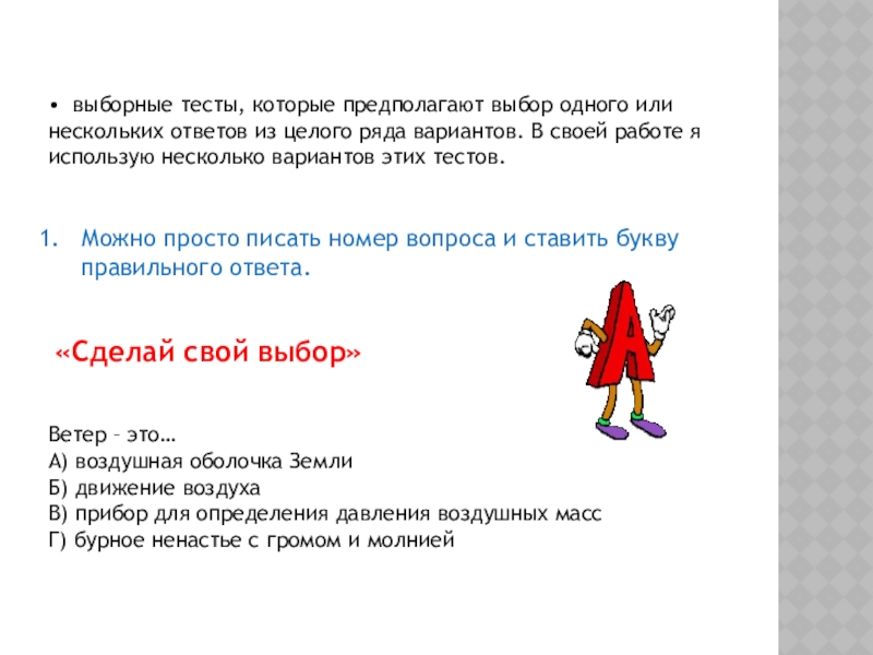 Слайд 13• выборные тесты, которые предполагают выбор одного или нескольких ответов из