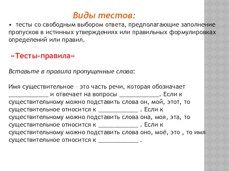• тесты со свободным выбором ответа, предполагающие заполнение пропусков в истинных утверждениях или правильных формулировках определений или правил.
