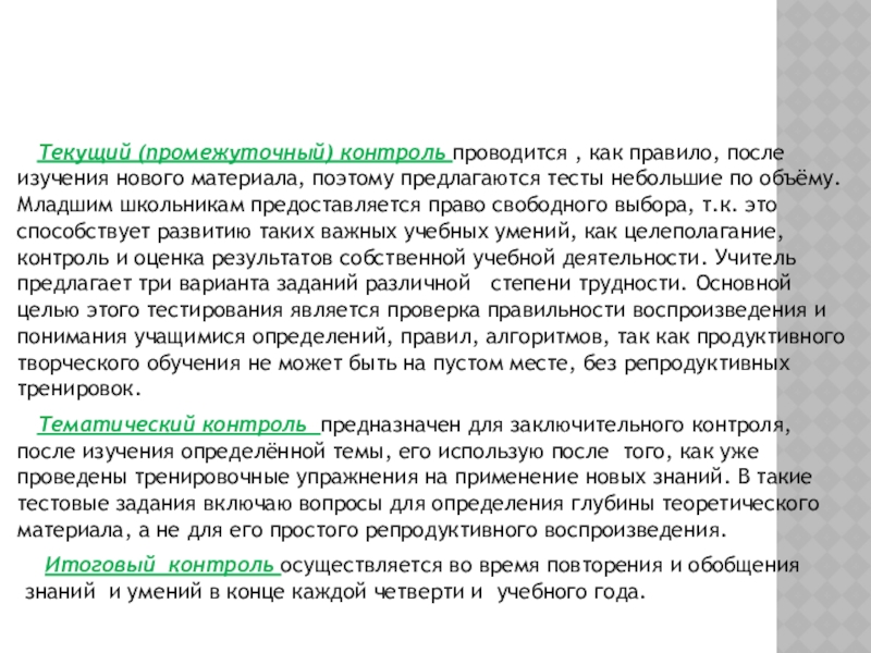 Тематический контроль предназначен для заключительного контроля, после изучения определённой темы, его использую после того, как уже проведены тренировочные упражнения на применение новых знаний. В такие тестовые задания включаю вопросы для определения глубины теоретического материала, а не для его простого репродуктивного воспроизведения.