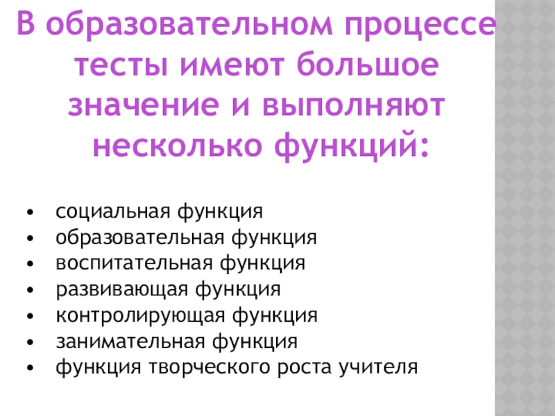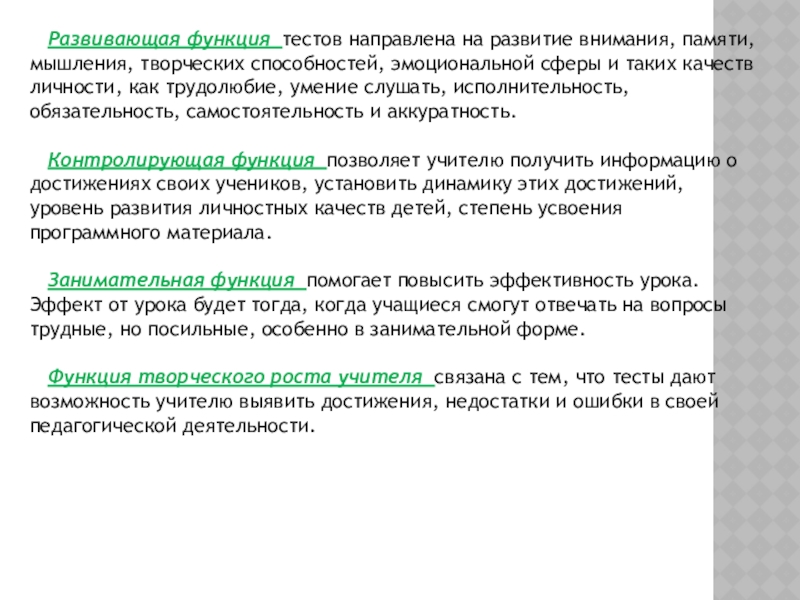 Слайд 7 Развивающая функция тестов направлена на развитие внимания, памяти, мышления,