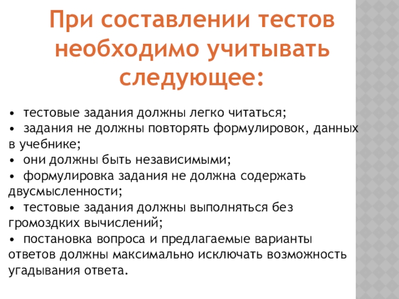 • постановка вопроса и предлагаемые варианты ответов должны максимально исключать возможность угадывания ответа.