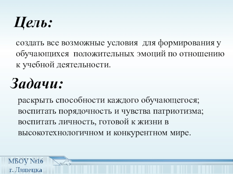 раскрыть способности каждого обучающегося; воспитать порядочность и чувства патриотизма; воспитать личность, готовой к жизни в высокотехнологичном и конкурентном мире.