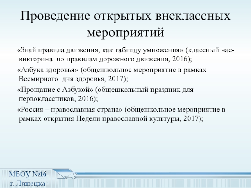 Слайд 21Проведение открытых внеклассных мероприятий
