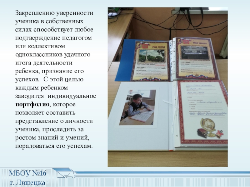 коллективом одноклассников удачного итога деятельности ребенка, признание его успехов. С этой целью каждым ребенком заводится индивидуальное портфолио, которое позволяет составить представление о личности ученика, проследить за ростом знаний и умений, порадоваться его успехам.