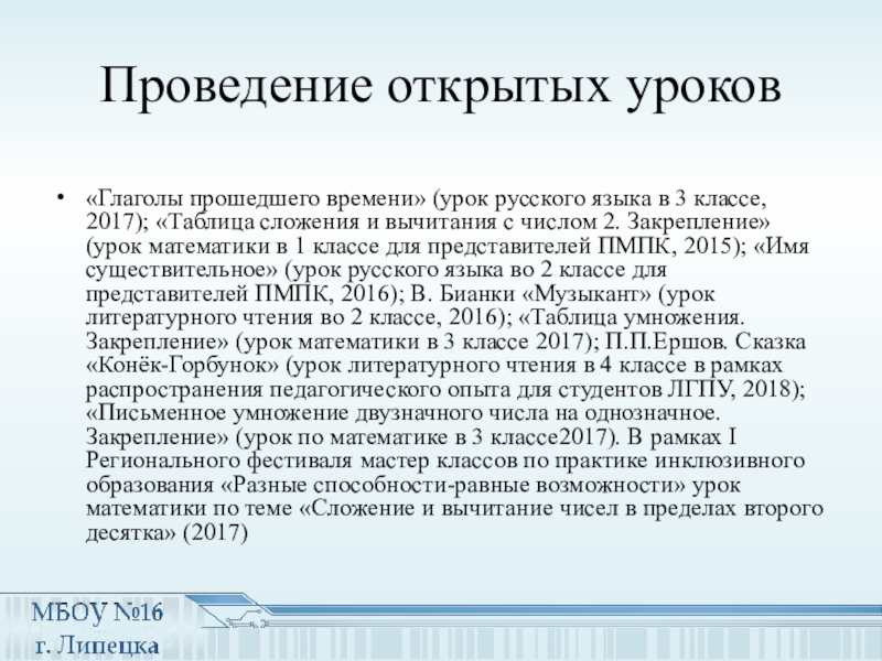 2017); «Таблица сложения и вычитания с числом 2. Закрепление» (урок математики в 1 классе для представителей ПМПК, 2015); «Имя существительное» (урок русского языка во 2 классе для представителей ПМПК, 2016); В. Бианки «Музыкант» (урок литературного чтения во 2 классе, 2016); «Таблица умножения. Закрепление» (урок математики в 3 классе 2017); П.П.Ершов. Сказка «Конёк-Горбунок» (урок литературного чтения в 4 классе в рамках распространения педагогического опыта для студентов ЛГПУ, 2018); «Письменное умножение двузначного числа на однозначное. Закрепление» (урок по математике в 3 классе2017). В рамках I Регионального фестиваля мастер классов по практике инклюзивного образования «Разные способности-равные возможности» урок математики по теме «Сложение и вычитание чисел в пределах второго десятка» (2017)