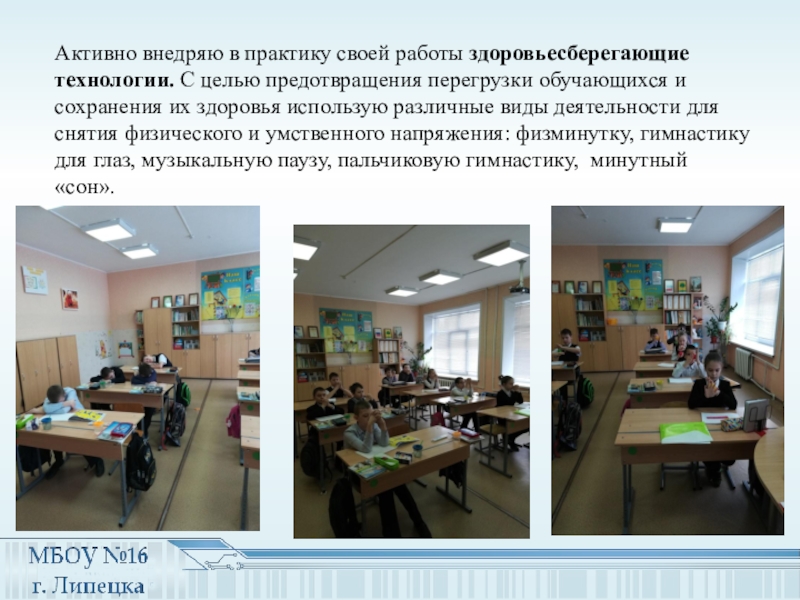 Слайд 17Активно внедряю в практику своей работы здоровьесберегающие технологии. С целью предотвращения