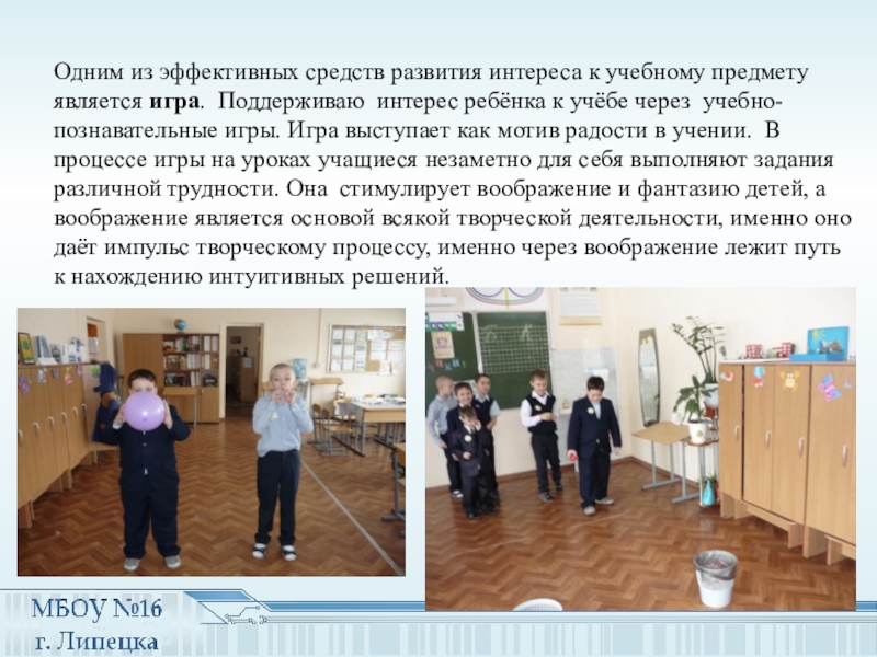 Поддерживаю интерес ребёнка к учёбе через учебно-познавательные игры. Игра выступает как мотив радости в учении. В процессе игры на уроках учащиеся незаметно для себя выполняют задания различной трудности. Она стимулирует воображение и фантазию детей, а воображение является основой всякой творческой деятельности, именно оно даёт импульс творческому процессу, именно через воображение лежит путь к нахождению интуитивных решений.