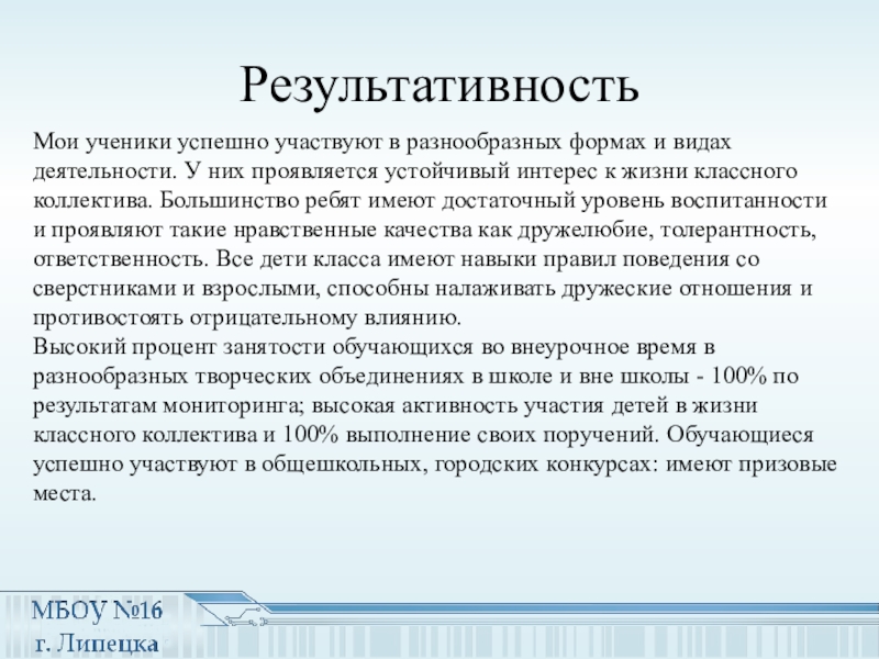 Высокий процент занятости обучающихся во внеурочное время в разнообразных творческих объединениях в школе и вне школы - 100% по результатам мониторинга; высокая активность участия детей в жизни классного коллектива и 100% выполнение своих поручений. Обучающиеся успешно участвуют в общешкольных, городских конкурсах: имеют призовые места.