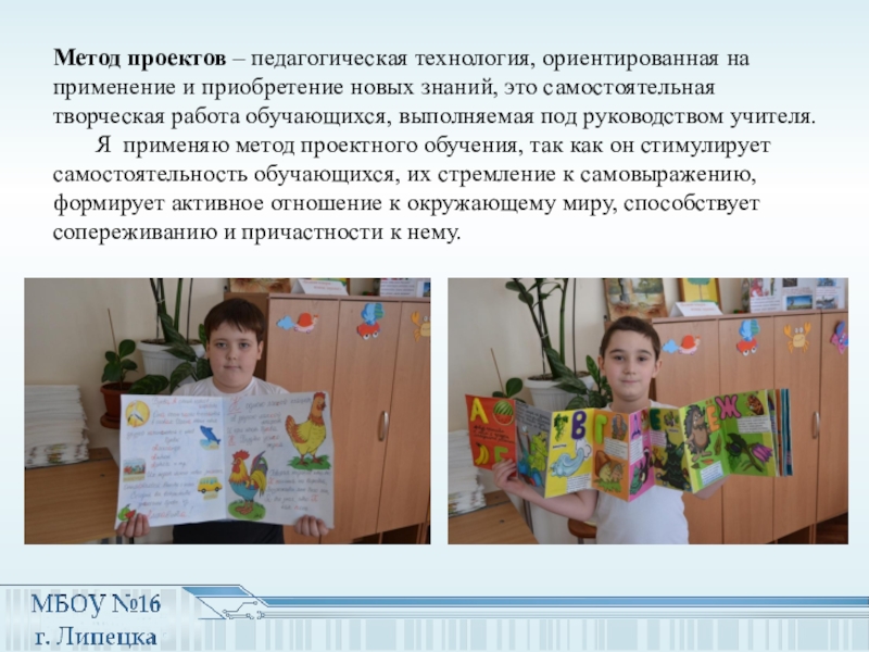 Я применяю метод проектного обучения, так как он стимулирует самостоятельность обучающихся, их стремление к самовыражению, формирует активное отношение к окружающему миру, способствует сопереживанию и причастности к нему.