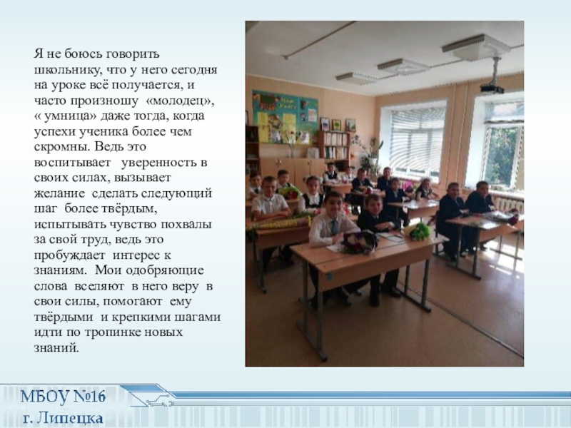 всё получается, и часто произношу «молодец», « умница» даже тогда, когда успехи ученика более чем скромны. Ведь это воспитывает уверенность в своих силах, вызывает желание сделать следующий шаг более твёрдым, испытывать чувство похвалы за свой труд, ведь это пробуждает интерес к знаниям. Мои одобряющие слова вселяют в него веру в свои силы, помогают ему твёрдыми и крепкими шагами идти по тропинке новых знаний.