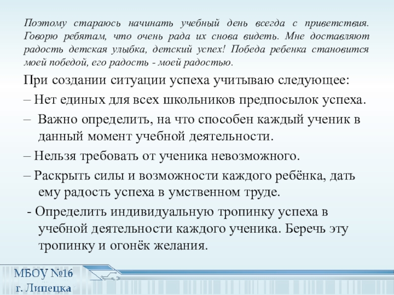 При создании ситуации успеха учитываю следующее: