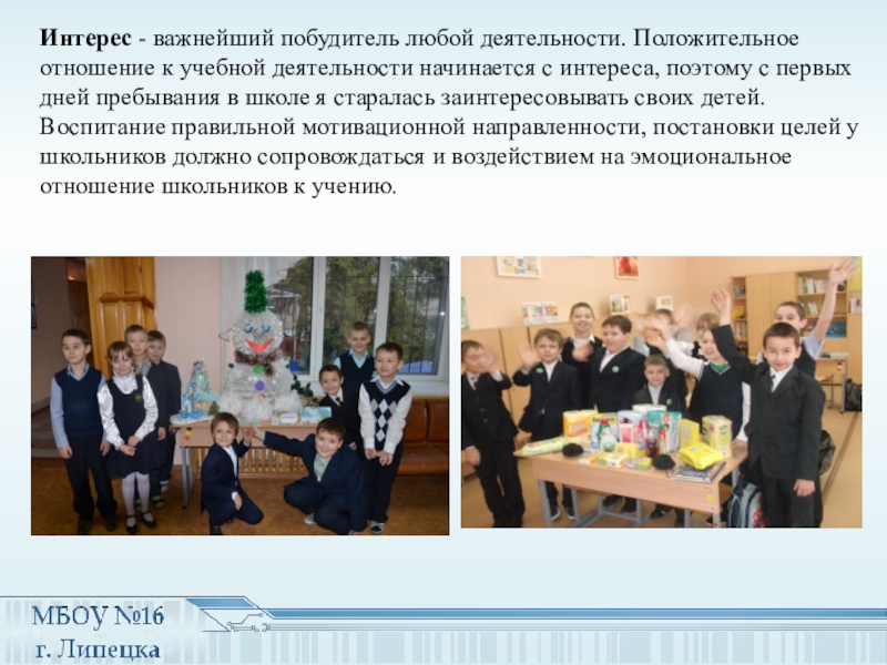 начинается с интереса, поэтому с первых дней пребывания в школе я старалась заинтересовывать своих детей. Воспитание правильной мотивационной направленности, постановки целей у школьников должно сопровождаться и воздействием на эмоциональное отношение школьников к учению.
