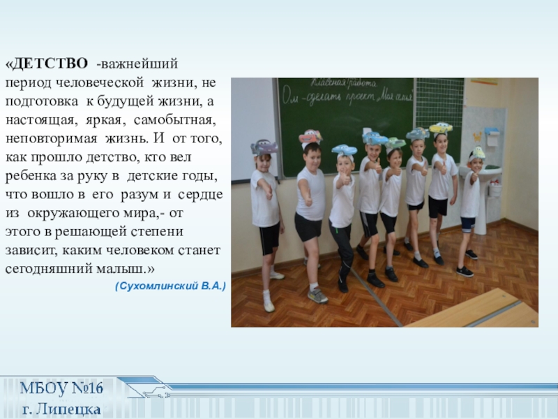 настоящая, яркая, самобытная, неповторимая жизнь. И от того, как прошло детство, кто вел ребенка за руку в детские годы, что вошло в его разум и сердце из окружающего мира,- от этого в решающей степени зависит, каким человеком станет сегодняшний малыш.»