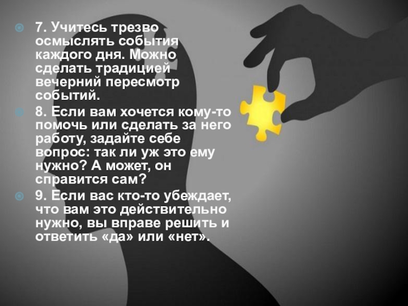 7. Учитесь трезво осмыслять события каждого дня. Можно сделать традицией вечерний пересмотр событий.