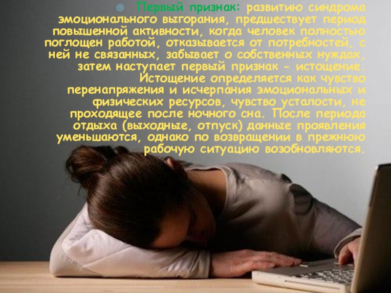 Слайд 10Первый признак: развитию синдрома эмоционального выгорания, предшествует период повышенной активности, когда