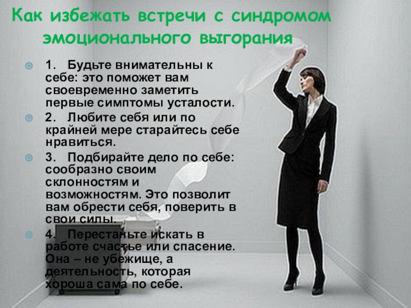 Слайд 20 Как избежать встречи с синдромом эмоционального выгорания