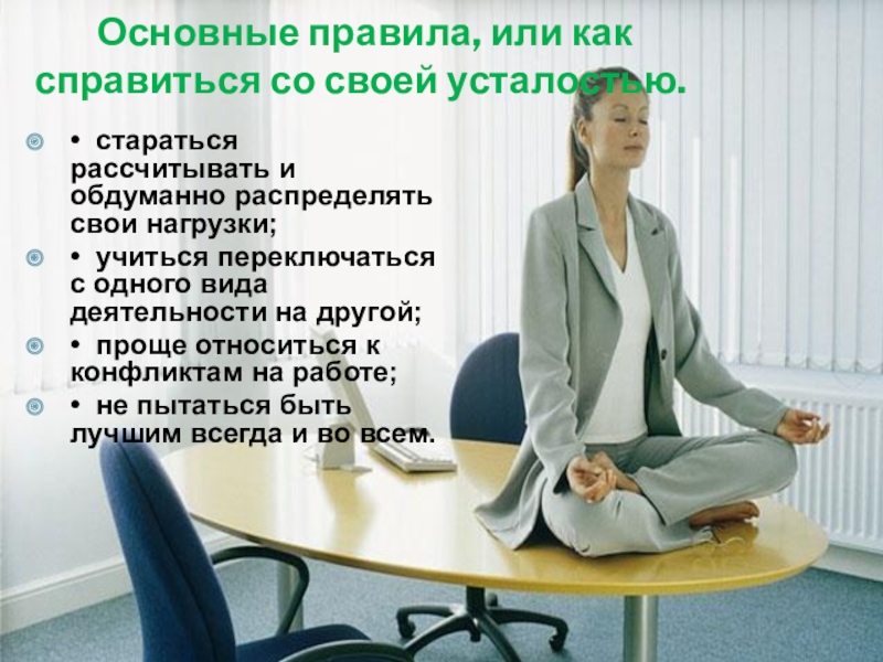 Слайд 22 Основные правила, или как справиться со своей усталостью.