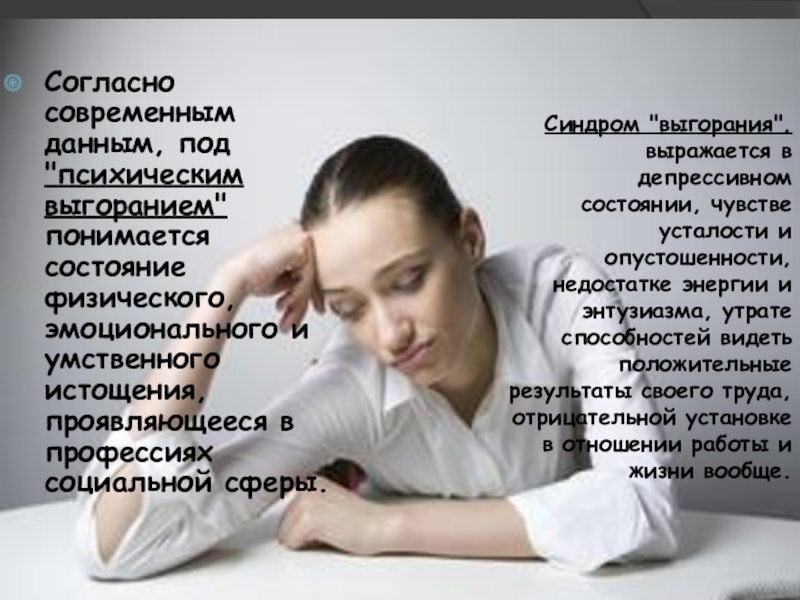 Слайд 4Согласно современным данным, под "психическим выгоранием" понимается состояние физического, эмоционального и
