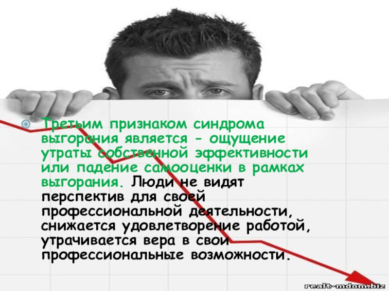 Слайд 12Третьим признаком синдрома выгорания является - ощущение утраты собственной эффективности или