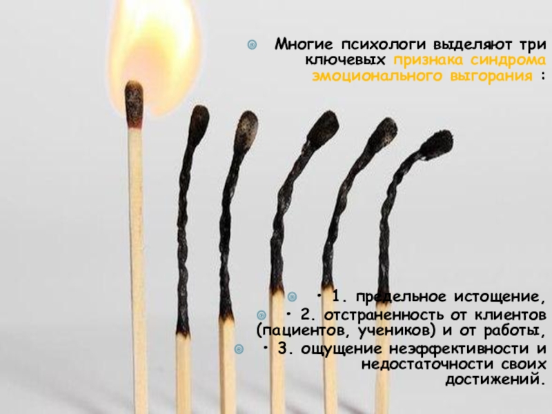Слайд 9Многие психологи выделяют три ключевых признака синдрома эмоционального выгорания :