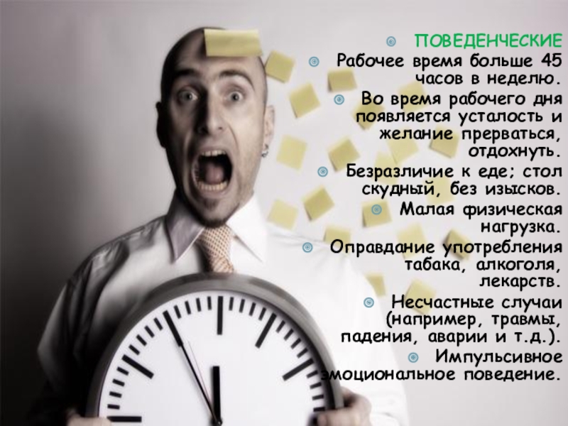 Рабочее время больше 45 часов в неделю.