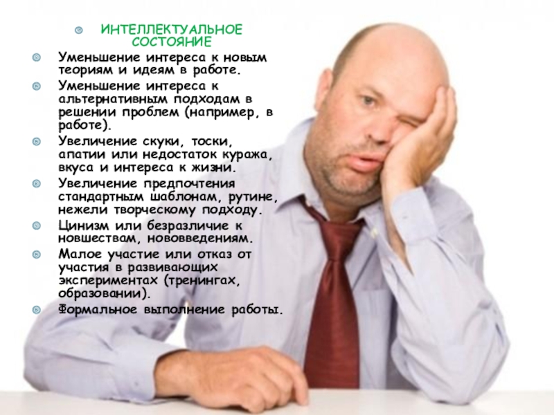 Уменьшение интереса к новым теориям и идеям в работе.