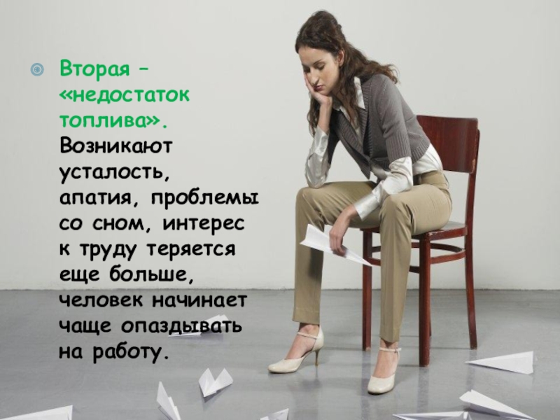 Слайд 6Вторая – «недостаток топлива». Возникают усталость, апатия, проблемы со сном, интерес
