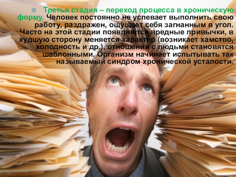 успевает выполнить свою работу, раздражен, ощущает себя загнанным в угол. Часто на этой стадии появляются вредные привычки, в худшую сторону меняется характер (возникает хамство, холодность и др.), отношения с людьми становятся шаблонными. Организм начинает испытывать так называемый синдром хронической усталости.