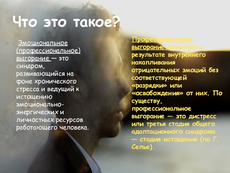 Профессиональное выгорание возникает в результате внутреннего накапливания отрицательных эмоций без соответствующей «разрядки» или «освобождения» от них. По существу, профессиональное выгорание — это дистресс или третья стадия общего адаптационного синдрома — стадия истощения (по Г. Селье).