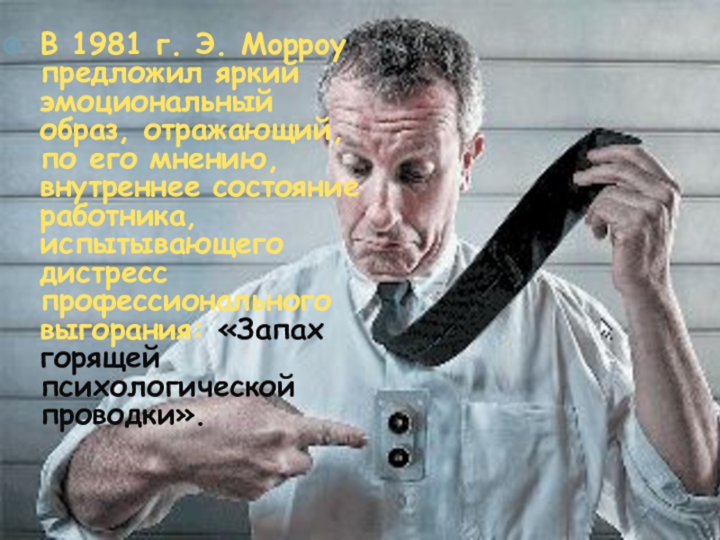 его мнению, внутреннее состояние работника, испытывающего дистресс профессионального выгорания: «Запах горящей психологической проводки».