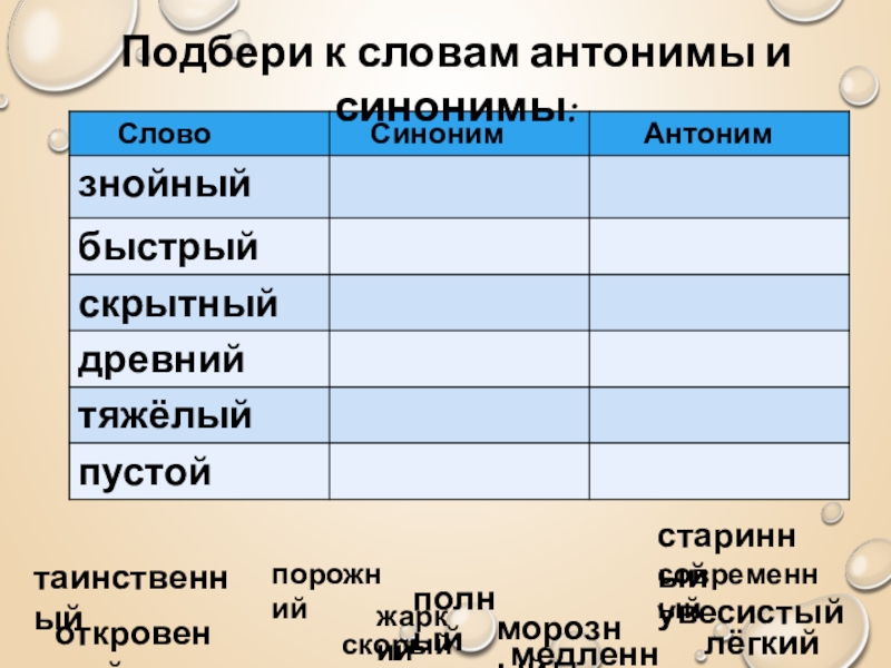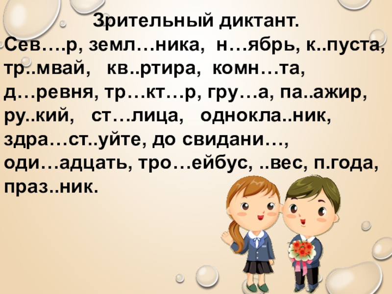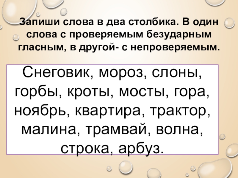 Снеговик, мороз, слоны, горбы, кроты, мосты, гора, ноябрь, квартира, трактор, малина, трамвай, волна, строка, арбуз.