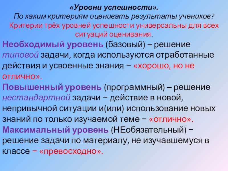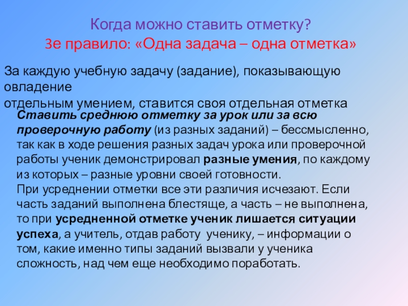 При усреднении отметки все эти различия исчезают. Если часть заданий выполнена блестяще, а часть – не выполнена, то при усредненной отметке ученик лишается ситуации успеха, а учитель, отдав работу ученику, – информации о том, какие именно типы заданий вызвали у ученика сложность, над чем еще необходимо поработать.