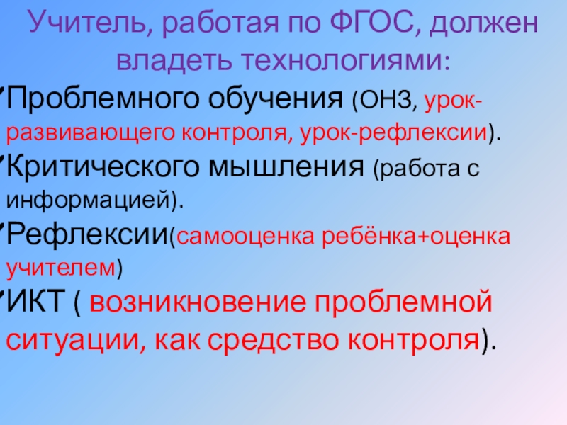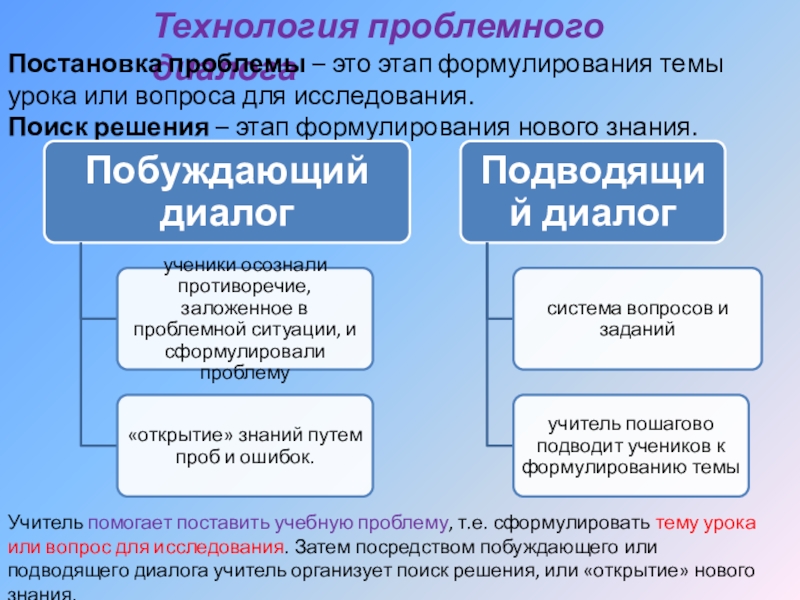 Учитель помогает поставить учебную проблему, т.е. сформулировать тему урока или вопрос для исследования. Затем посредством побуждающего или подводящего диалога учитель организует поиск решения, или «открытие» нового знания.