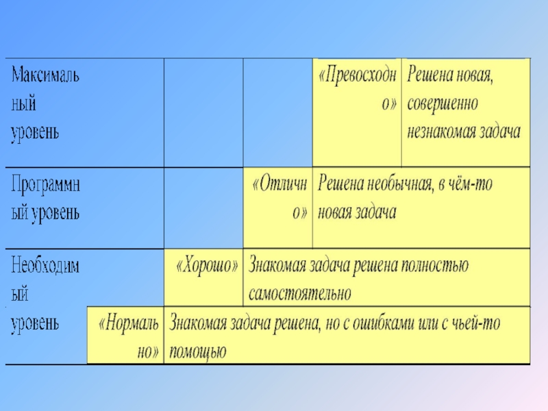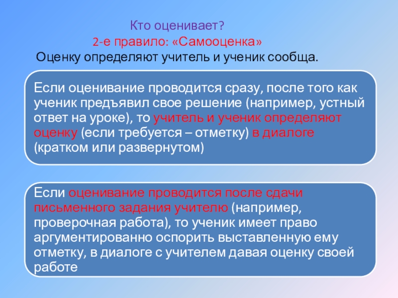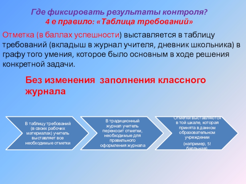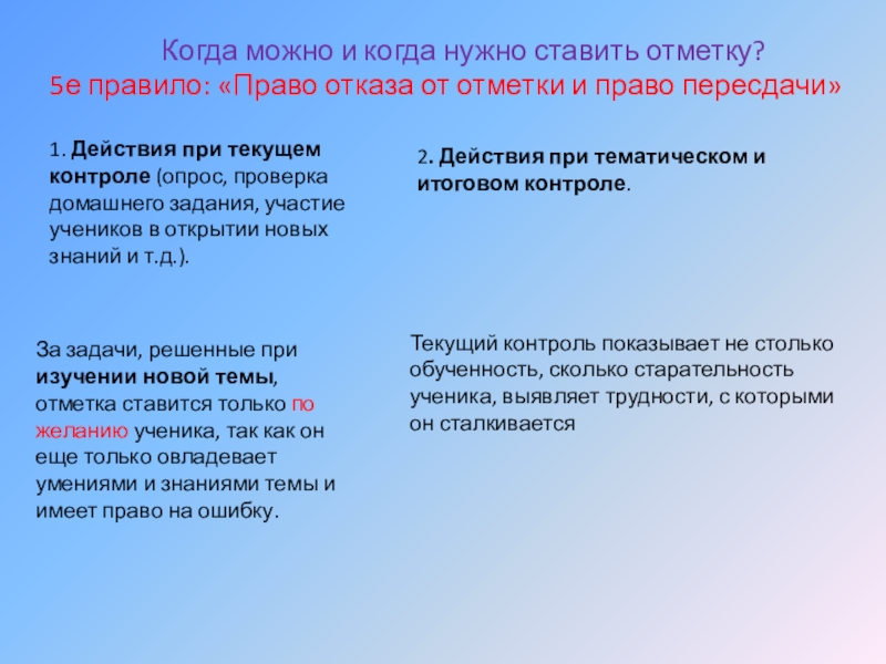 За задачи, решенные при изучении новой темы, отметка ставится только по желанию ученика, так как он еще только овладевает умениями и знаниями темы и имеет право на ошибку.