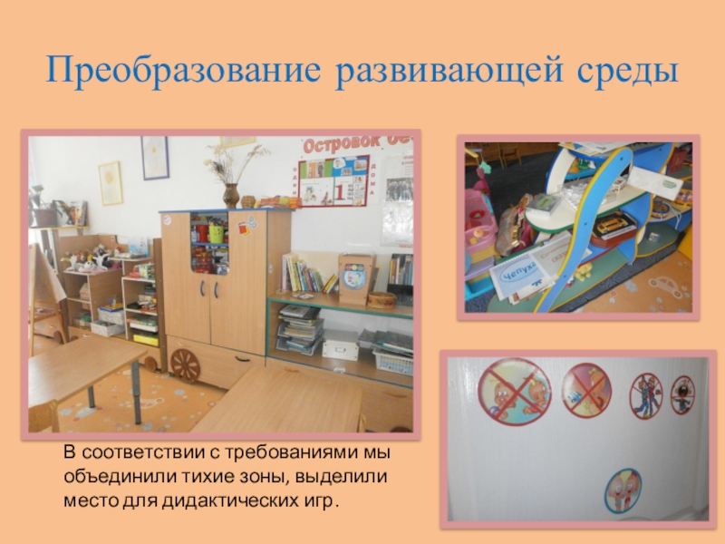 Преобразование развивающей средыВ соответствии с требованиями мы объединили тихие зоны, выделили место для дидактических игр.
